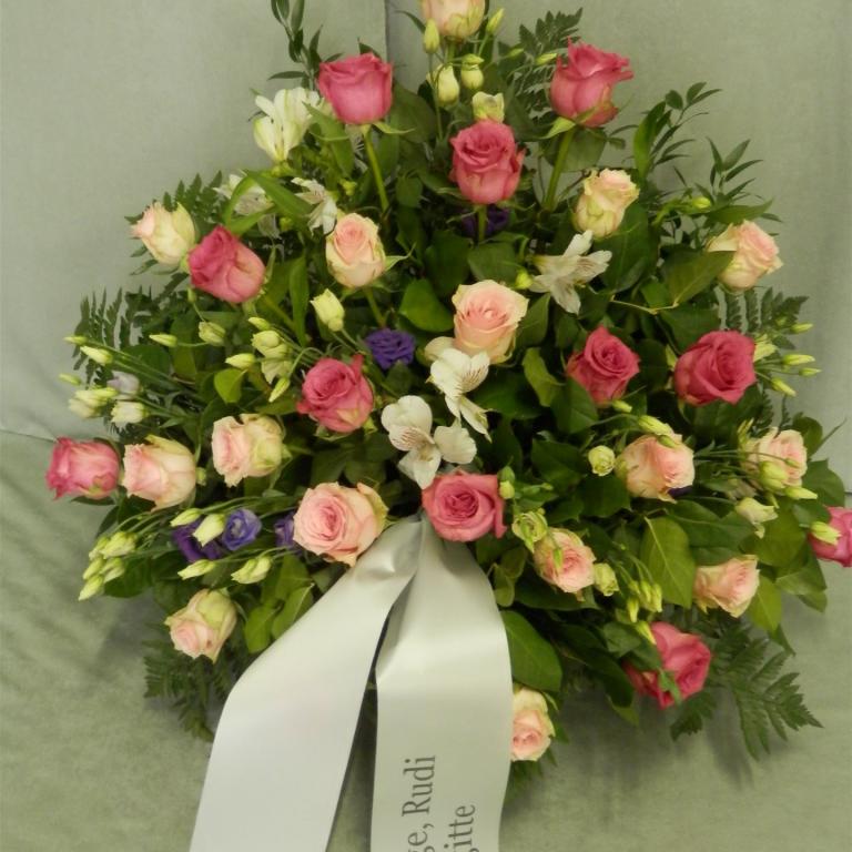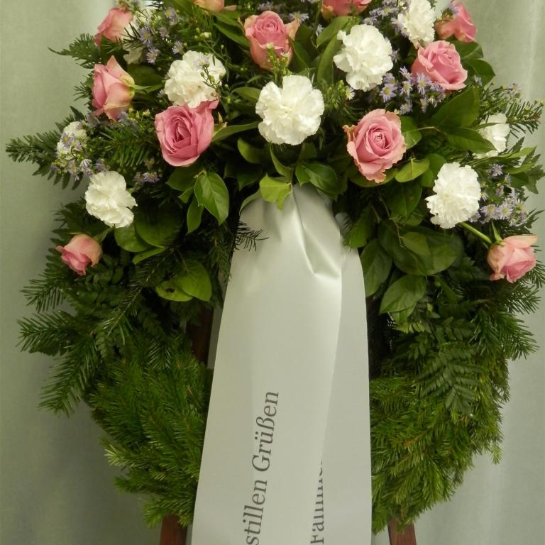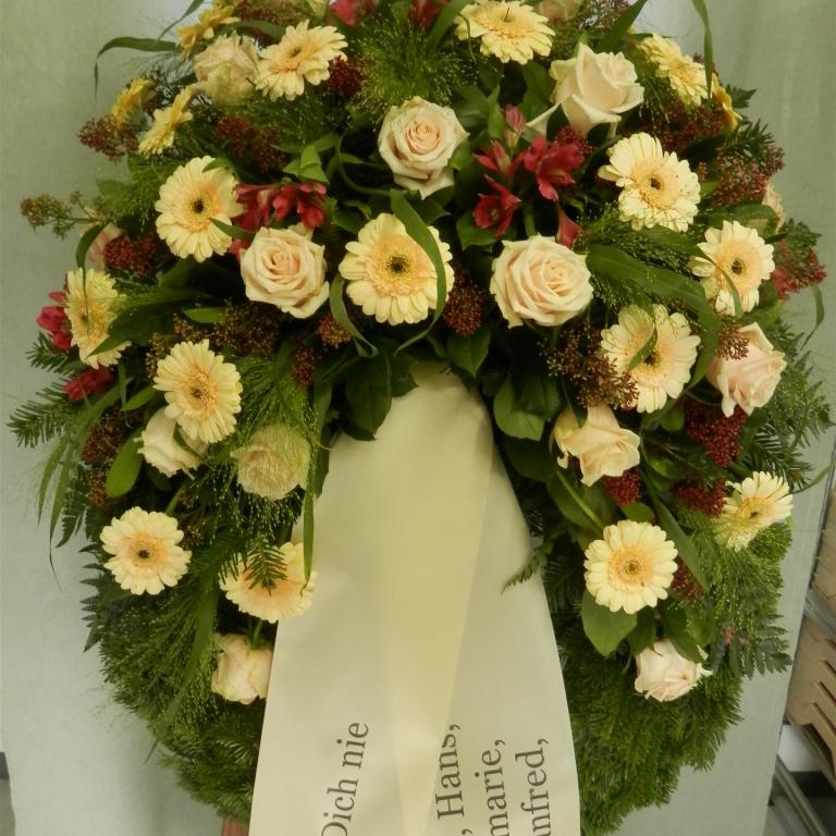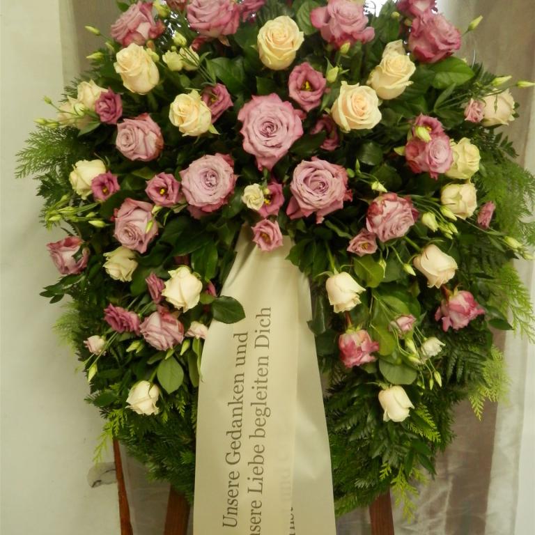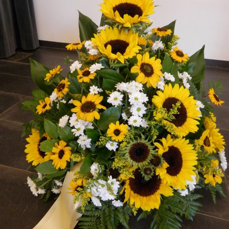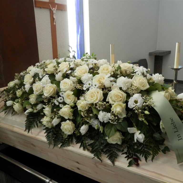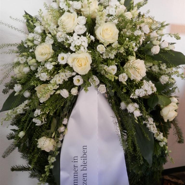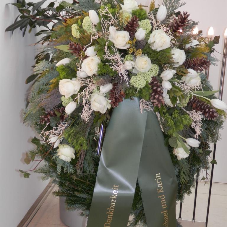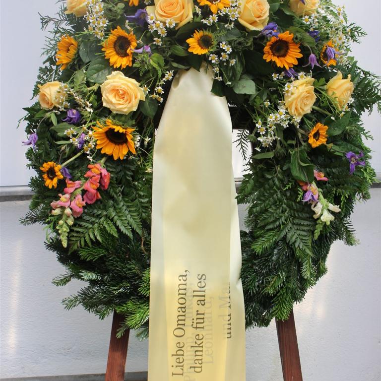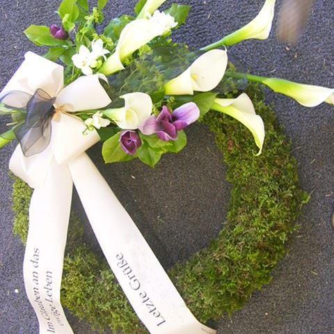 Verabschieden Sie sich von ihren Liebsten mit Kränzen, Buketts oder Sarggestecken und geben Sie mit passenden Schleifen in verschiedenen Farben eine Grußbotschaft mit auf den Weg.