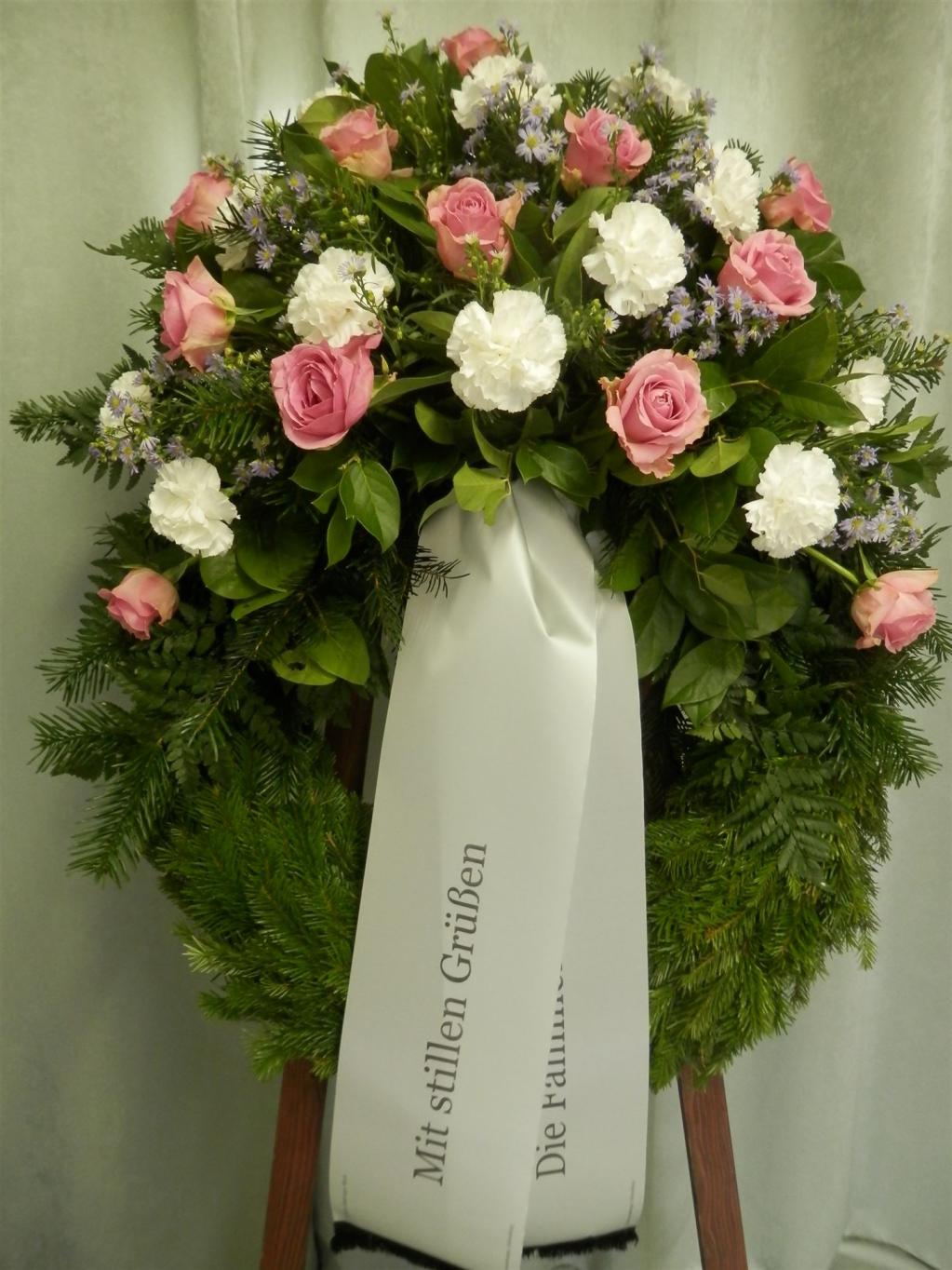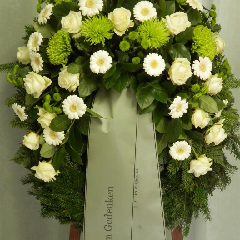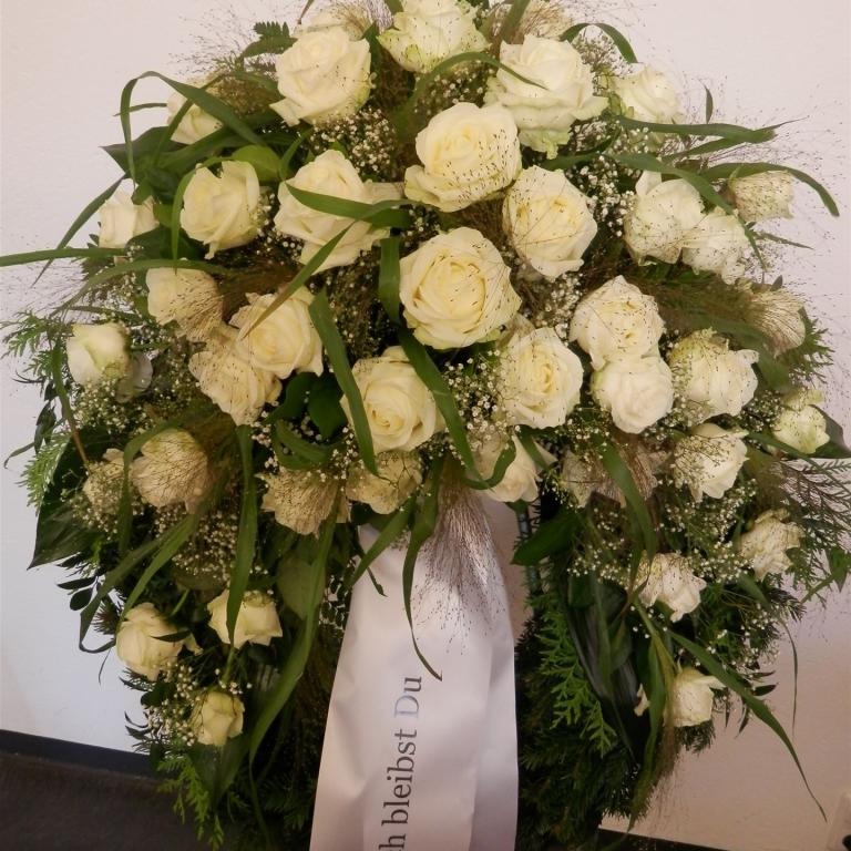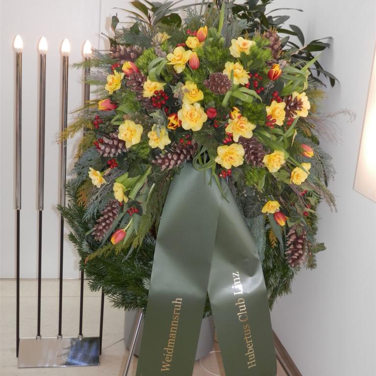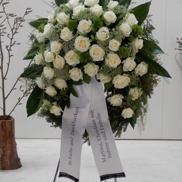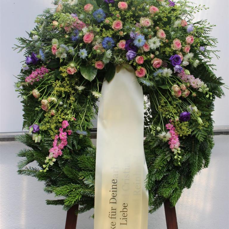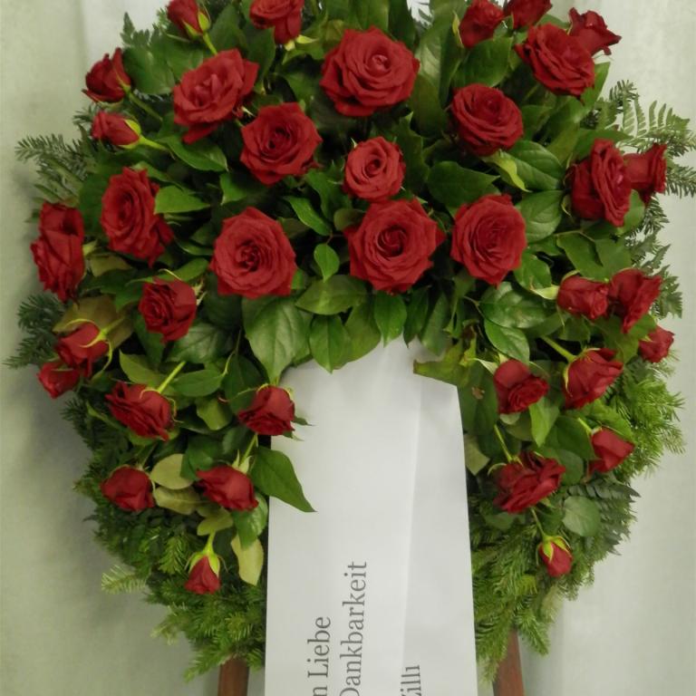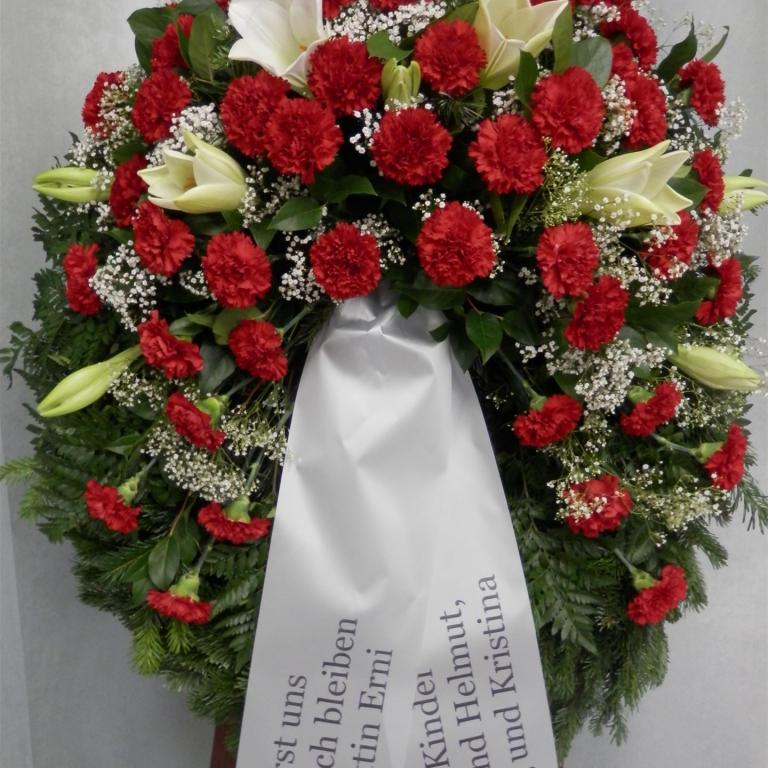 Verabschieden Sie sich von ihren Liebsten mit Kränzen, Buketts oder Sarggestecken und geben Sie mit passenden Schleifen in verschiedenen Farben eine Grußbotschaft mit auf den Weg.