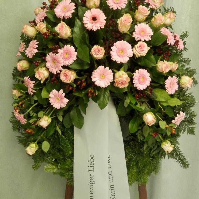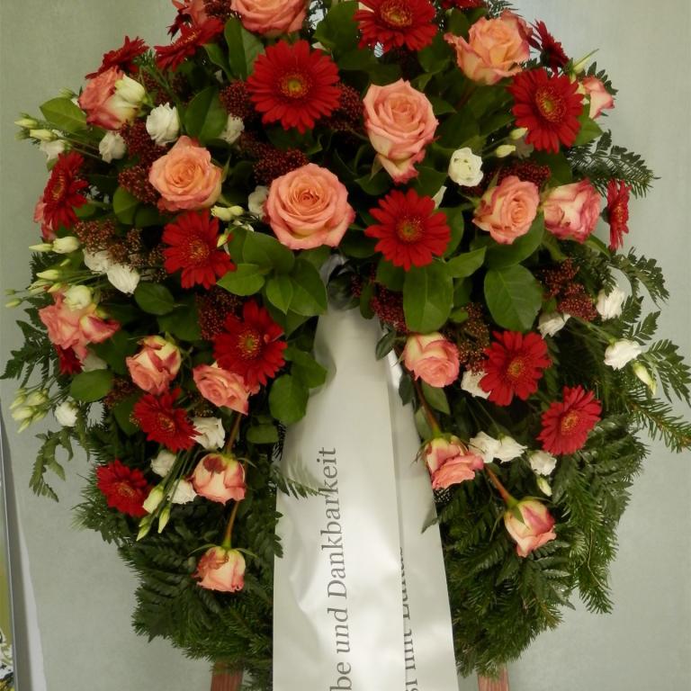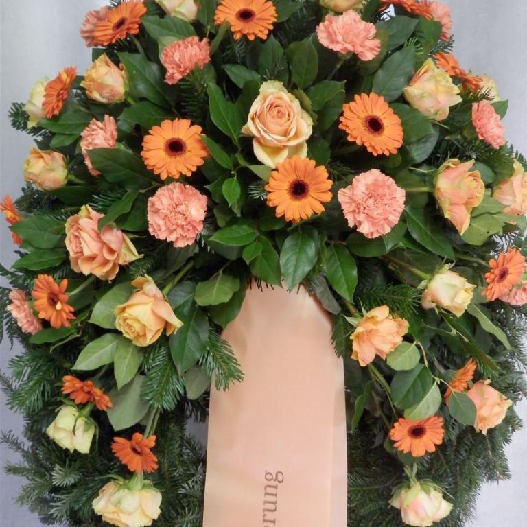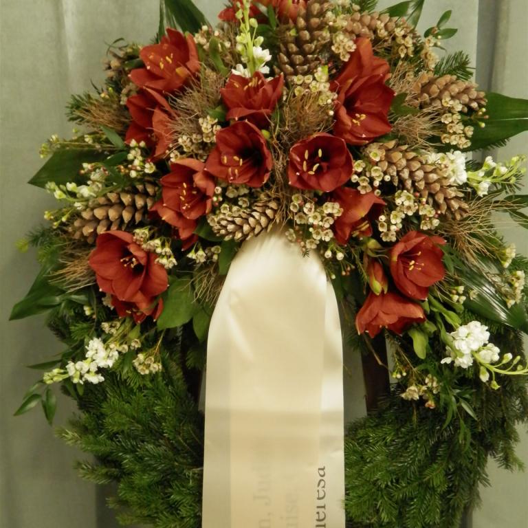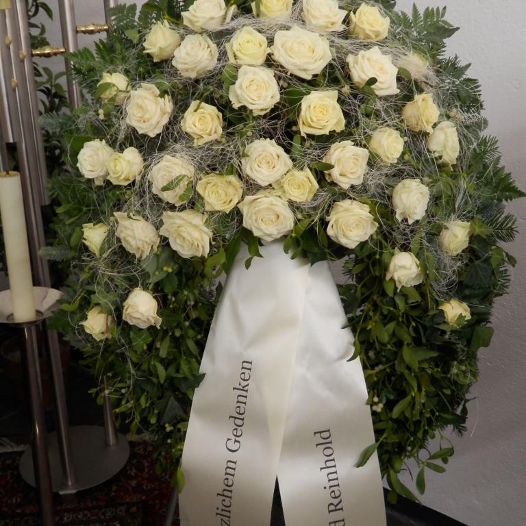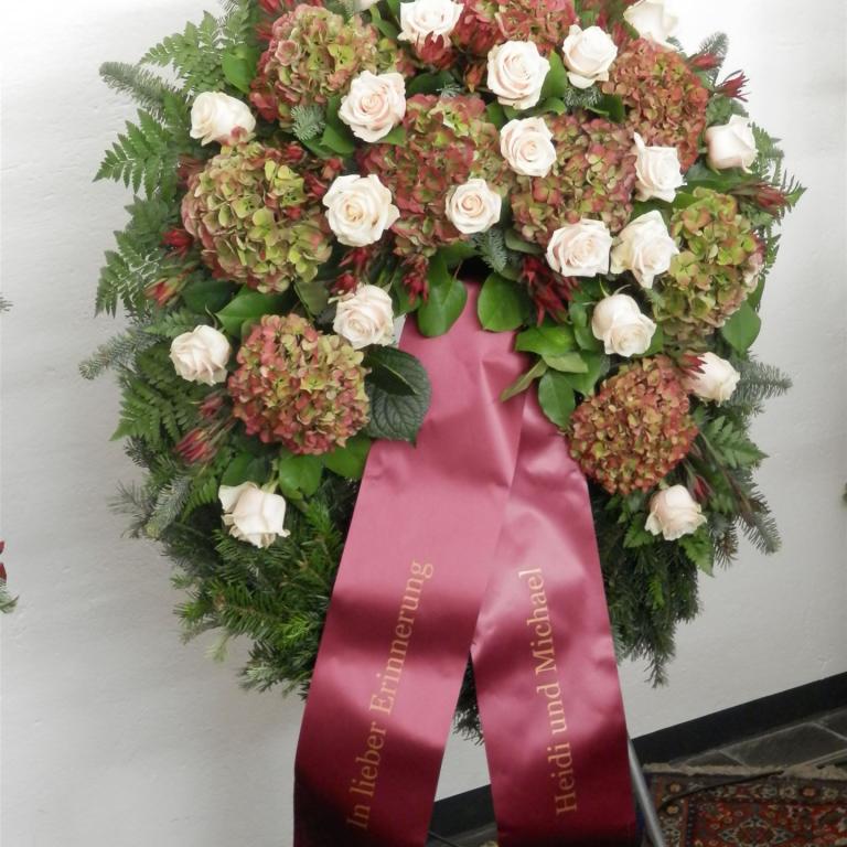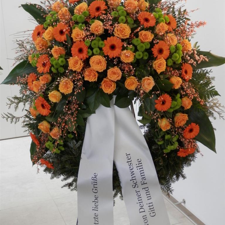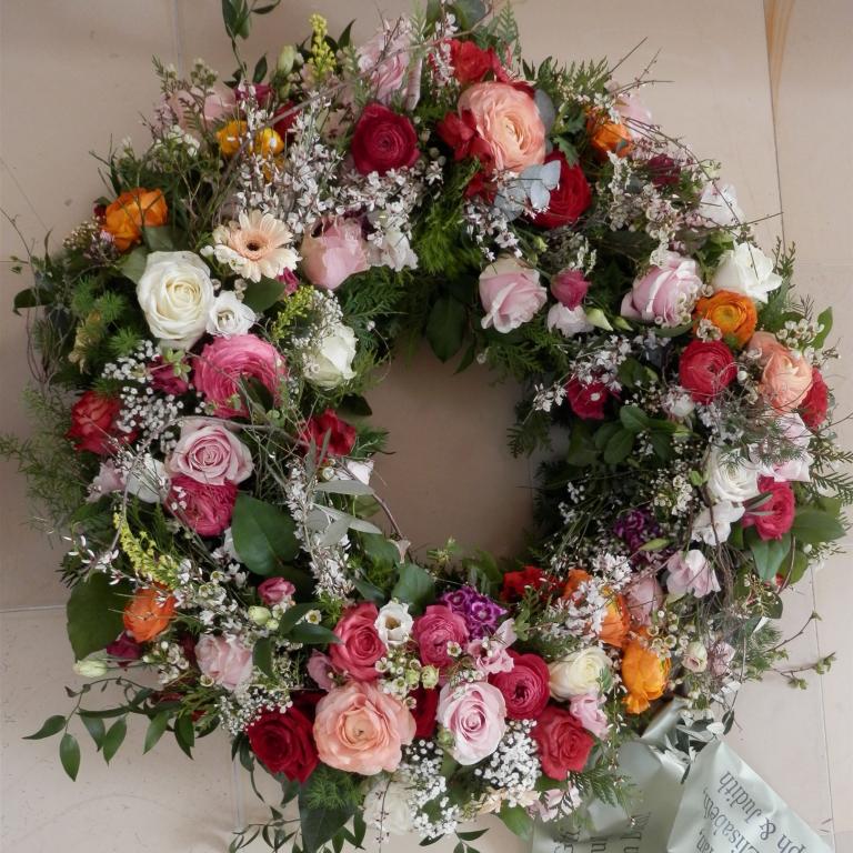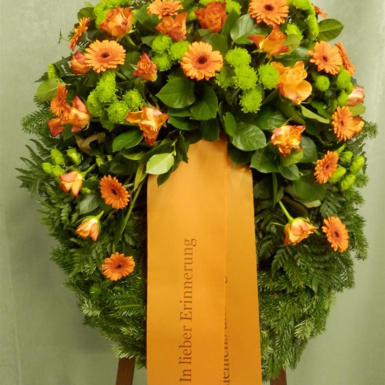 Verabschieden Sie sich von ihren Liebsten mit Kränzen, Buketts oder Sarggestecken und geben Sie mit passenden Schleifen in verschiedenen Farben eine Grußbotschaft mit auf den Weg.